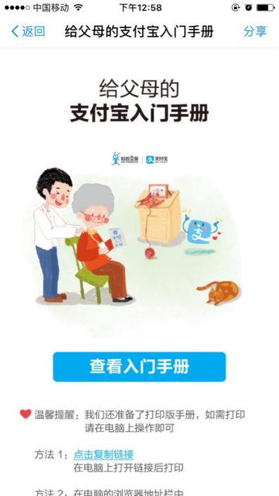 而廣告語下方還埋了各個“彩蛋”——掃一掃二維碼,居然真的能立刻get到一本《給父母的支付寶入門手冊》。