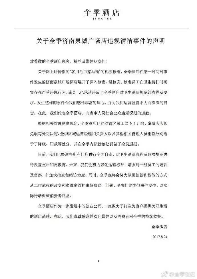 我們來對比一下,同樣是昨天發生的另一個危機公關版本:《全季酒店用洗臉毛巾擦馬桶事件》